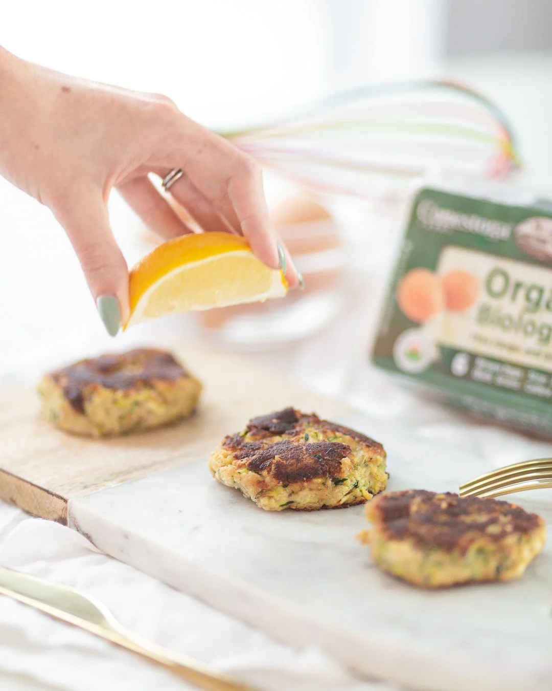 These fritters are made using Conestoga Farms Organic Eggs, which are laid by Ontario-raised, organically fed laying hens that live on free range farms, with access to outdoor pastures! Their organic feed is 100% vegetarian with no animal by-products.