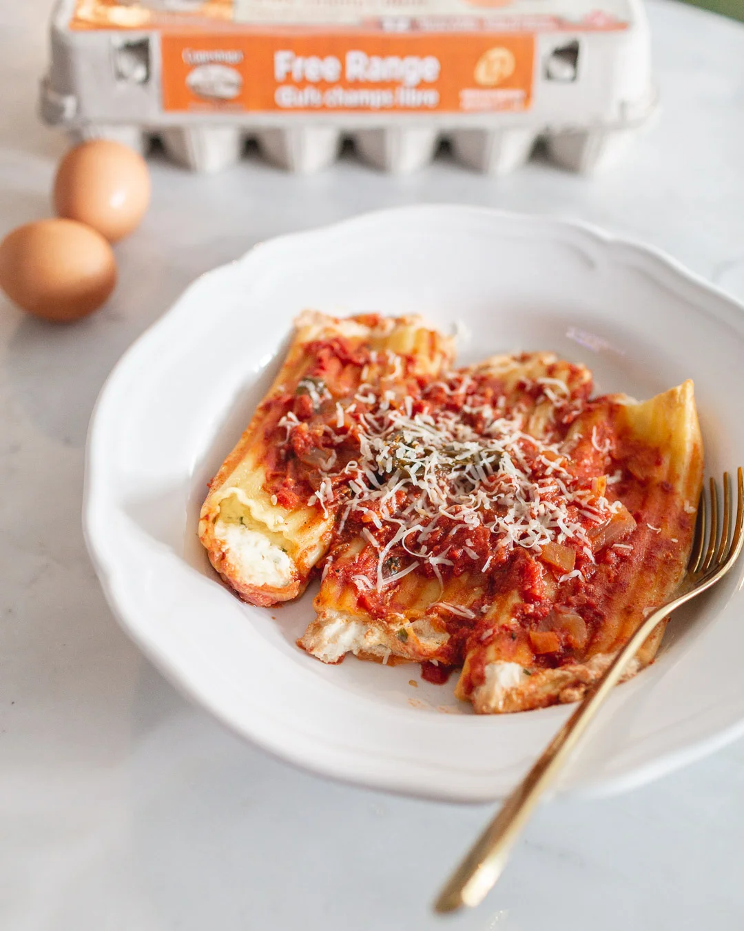 Using a small spoon, stuff the cheese mixture into the manicotti shells. You can also use a reusable plastic bag, place filling in the bag, cut off one corner and squeeze into partially cooked manicotti shells.