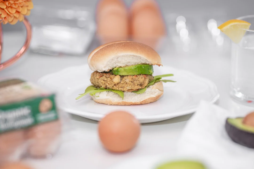 These burgers are made using Conestoga Farms Organic Eggs, which are are laid by Ontario-raised, organically fed laying hens that live on free range farms, with access to outdoor pastures. Their organic feed is 100% vegetarian with no animal by-products.
