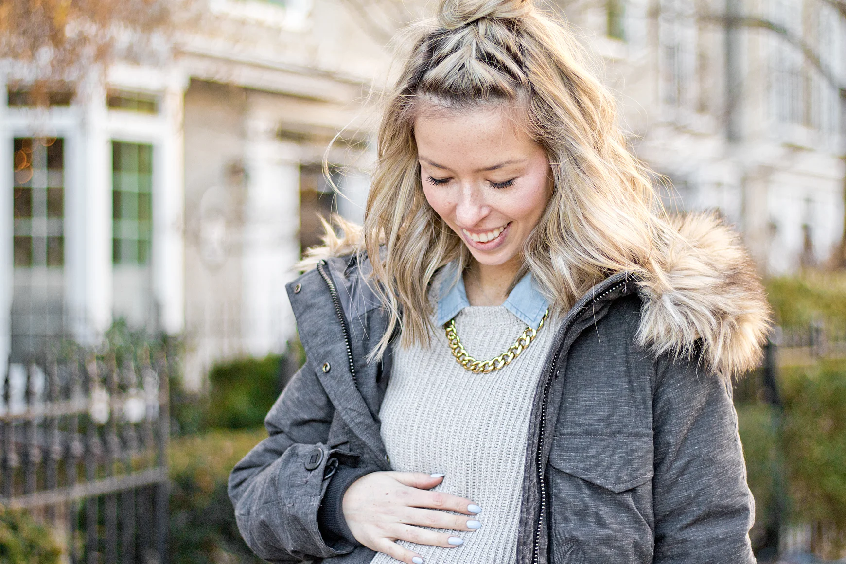This was my window shopping outfit a few weekends ago - comfy & cute. I'm pretty much living in leggings these days, and I've always loved the classic sweater and button-up combo. Baby has just about outgrown this denim shirt though - I had leave a few of the buttons open!